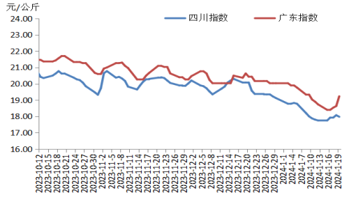 本周,四川豬肉周均價(jià)為每公斤17.93元,環(huán)比持平,同比下跌10.1%,較上周收窄0.4個(gè)百分點(diǎn)。受北方生豬價(jià)格上漲行情影響,本地散養(yǎng)戶惜售情緒升溫,出欄生豬的積極性轉(zhuǎn)弱,屠宰企業(yè)豬肉供應(yīng)短時(shí)偏緊;腌臘、灌香腸活動(dòng)基本結(jié)束,加之“臘八節(jié)”備貨提振力度弱,豬肉價(jià)格主要受生豬價(jià)格波動(dòng)影響,先小幅上漲后小幅下跌??傮w看,四川地區(qū)豬肉周均價(jià)環(huán)比持平。