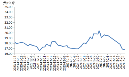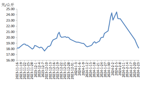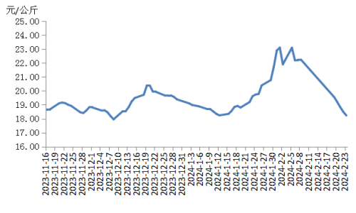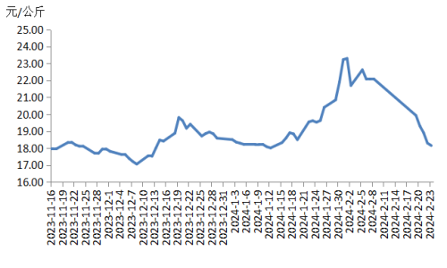 本周華中地區(qū)豬肉價(jià)格大幅下跌。規(guī)模養(yǎng)殖場積極出欄,受多地降雪影響,生豬向外省調(diào)運(yùn)不暢,致使本地區(qū)內(nèi)生豬及豬肉供應(yīng)充足。春節(jié)過后,終端消費(fèi)意愿降低。供增需減帶動(dòng)豬肉價(jià)格大幅下跌。