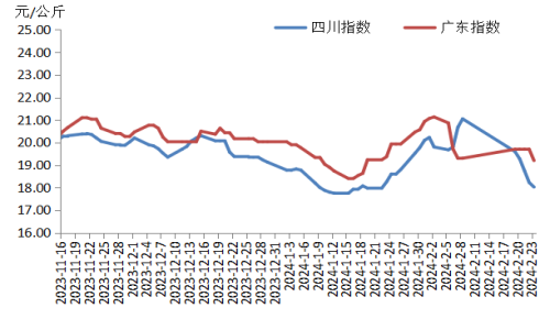 五、四川、廣東豬肉價(jià)格皆較節(jié)前下跌,同比由漲轉(zhuǎn)跌