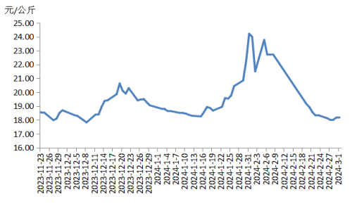 本周國內(nèi)瘦肉型白條豬肉出廠價格(以下簡稱“豬肉價格”)環(huán)比下跌。本周生豬出欄量逐漸恢復(fù),部分地區(qū)散養(yǎng)戶因看好后市而壓欄惜售,生豬及豬肉供應(yīng)較上周增幅有限。受元宵節(jié)提振和學校開學影響,豬肉需求略有好轉(zhuǎn),但總體依舊偏弱。總體看,豬肉供應(yīng)略大于需求,價格下跌。