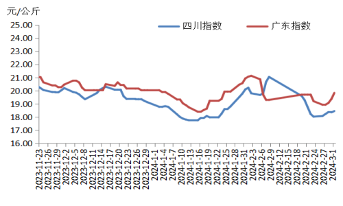 本周,廣東豬肉周均價為每公斤19.23元,環(huán)比下跌1.9%,同比下跌10.4%,跌幅擴大2.2個百分點。周前期,廣東地區(qū)豬肉供應(yīng)充裕,需求緩慢恢復(fù),經(jīng)銷商降價促銷;周后期,受南方地區(qū)豬肉價格上漲情緒提振,廣東地區(qū)挺價情緒漸起,豬肉價格上漲,但漲幅有限??傮w看,廣東地區(qū)豬肉周均價環(huán)比小幅下跌。