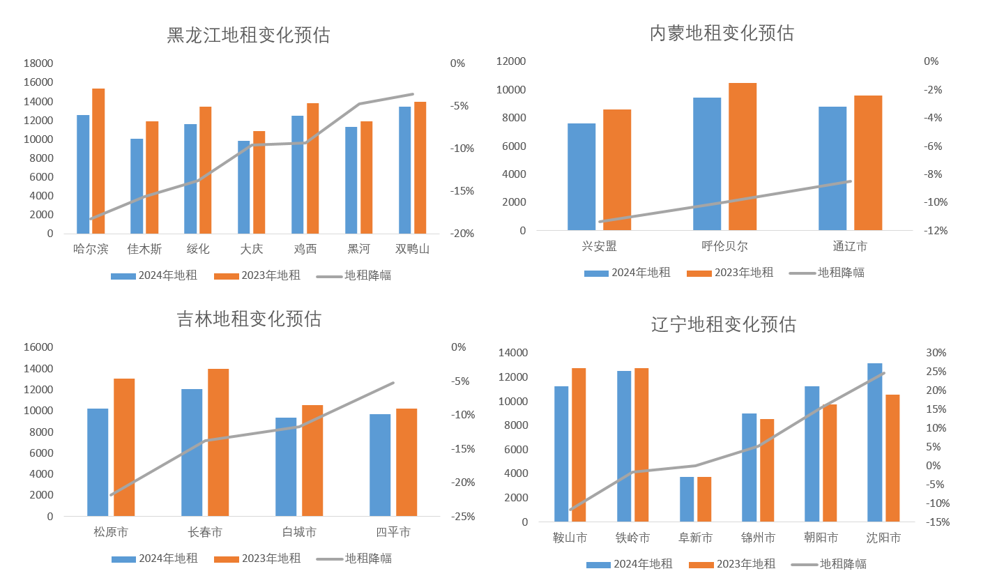 吉林主產(chǎn)區(qū)地租也是大多數(shù)下滑,中西部產(chǎn)區(qū)下降幅度多在15-20%,其中長春下降14%,樣本點(diǎn)地租成本均值從14000元/公頃下降至12050元/公頃;松原下降22%,樣本點(diǎn)地租成本均值從13000元/公頃下降至10200元/公頃;白城下降12%,樣本點(diǎn)地租成本均值從10600元/公頃下降至9300元/公頃;四平下降5%,樣本點(diǎn)地租成本均值從10250元/公頃下降至9700元/公頃。